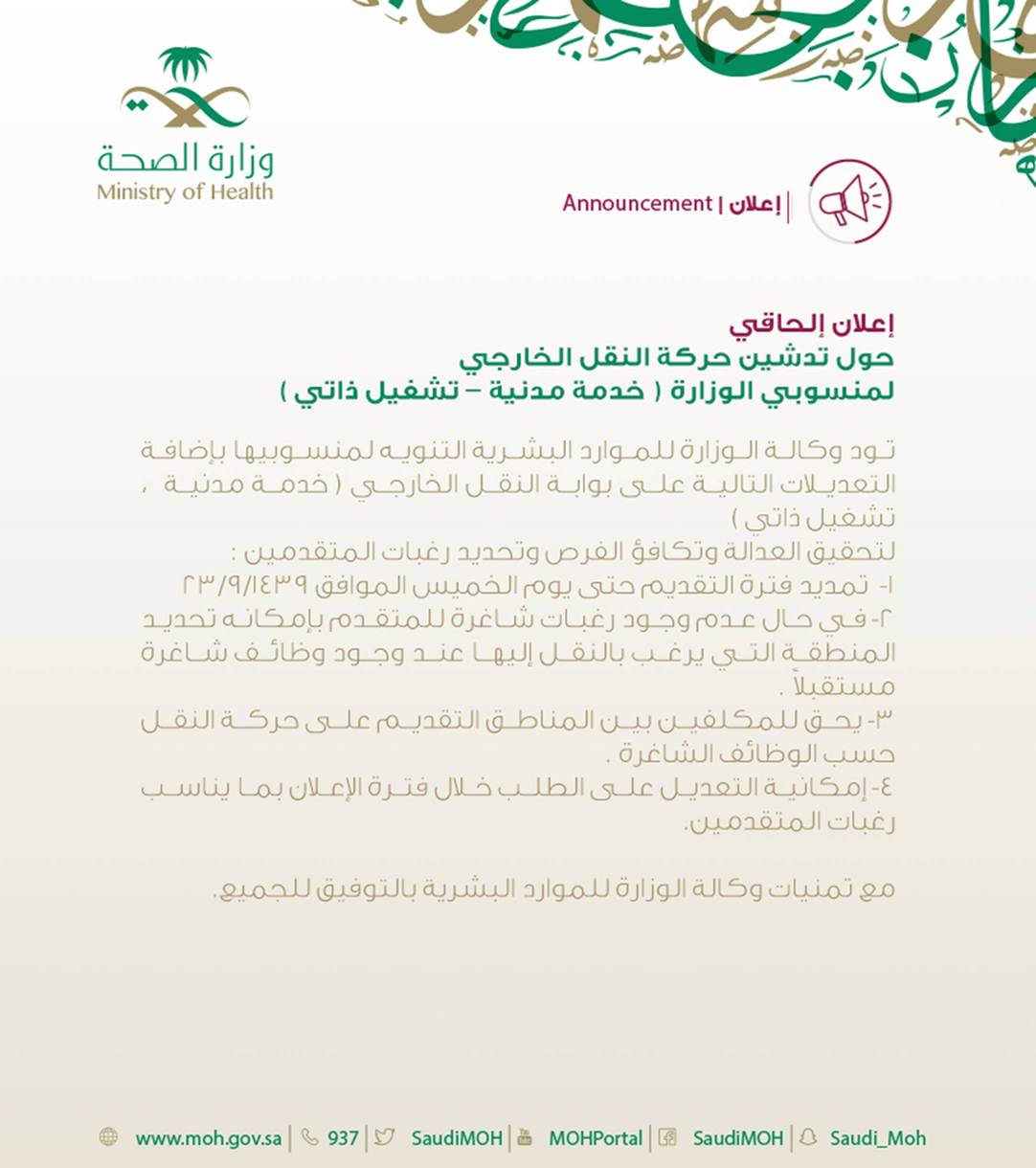 إعلان عن حركة نقل خارجية جديدة 1440 هـ. إعلان تقديم حركة النقل الصحة الخارجي 1439 هـ مايو 25, 2018 في وزارة الصحة. افتتاح حركة النقل الخارجي لعام 1439 هـ في 25/8/1439.